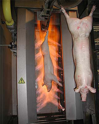 O chamuscador a gás usa chamas para queimar as cerdas residuais na carcaça do porco após um processo de remoção dos pelos. Isso também garante a esterilização da carcaça. O chamuscador atende aos requisitos para a produção em massa de carne de porco e é ideal para matadouros de médio e grande porte.