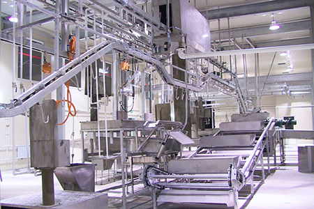 Fornecemos um sistema de transporte especialmente projetado para transporte de miudezas e inspeção veterinária. O equipamento é altamente automatizado e pode ser combinado com um transportador de suspensão de carcaça e um transportador de suspensão de miudezas brancas.