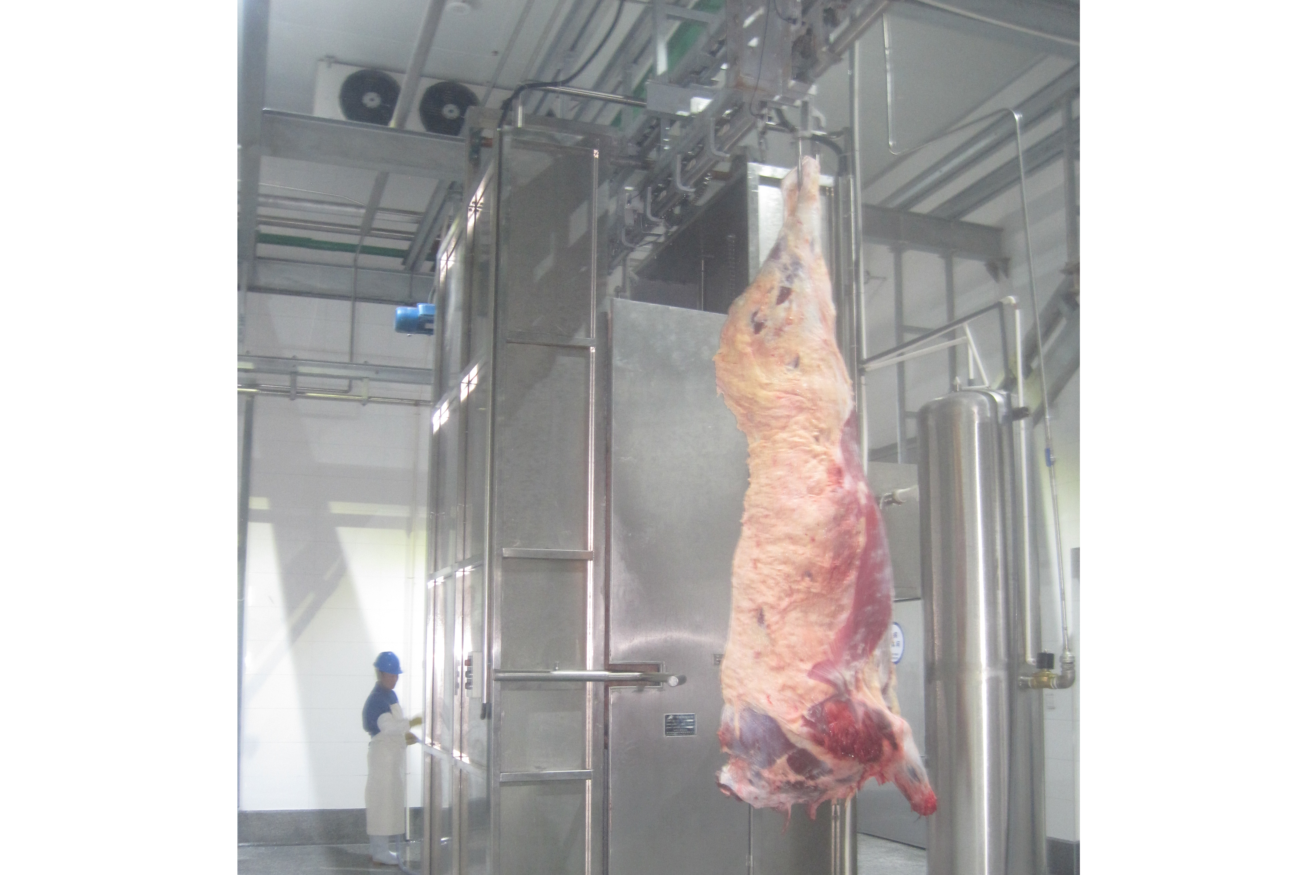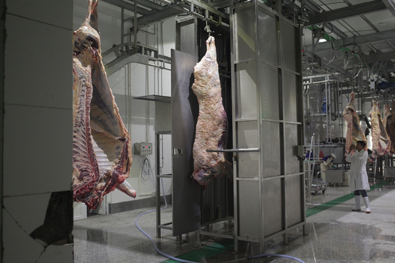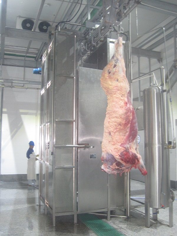 Uma vez cortada a carcaça de gado, as meias carcaças serão lavadas com uma lavadora de spray de carcaça de bovino.
