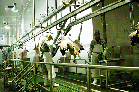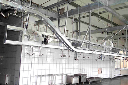 Durante o processo de operação, as duas pernas dianteiras são presas ao extrator de pele, enquanto as patas traseiras são presas ao transportador de sangramento. Esses dois transportadores operam simultaneamente nas mesmas velocidades. O transporte de carcaças de ovinos de maneira equilibrada impede que a lã se agarre à carcaça.