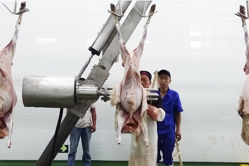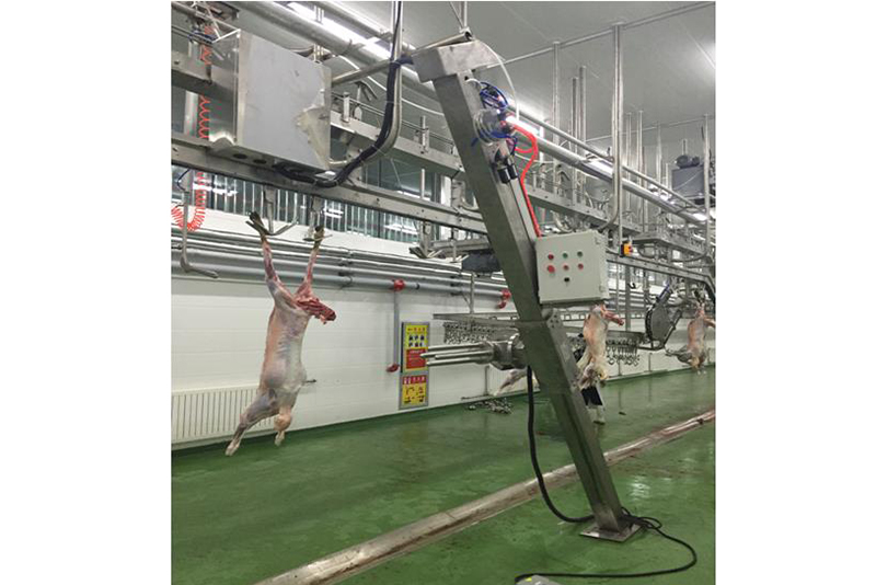 Cada barra de rolagem no extrator de pele de ovelha corresponde a uma ovelha no gancho automático da linha. Quando a carcaça é transportada para o extrator de peles, o pessoal operacional coloca a pele de carneiro pré-retirada na barra de rolagem, onde a restante da pele de carneiro é retirada em um processo contínuo. Este puxador de peles de ovelhas transporta várias ovelhas simultaneamente e não para a linha de produção, tornando-a excepcionalmente eficiente.
